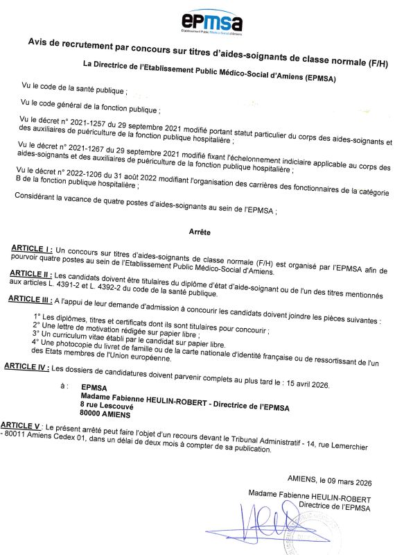 Avis de recrutement par concours sur titres d'Aides-Soignants