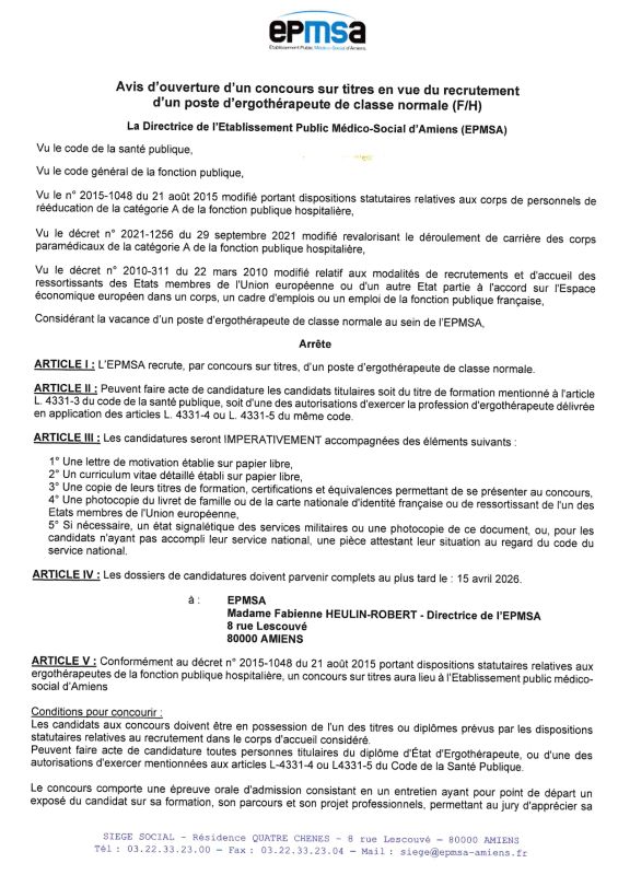 Avis d'ouverture d'un concours sur titres en vue du recrutement d'un poste d'ergothérapeute :