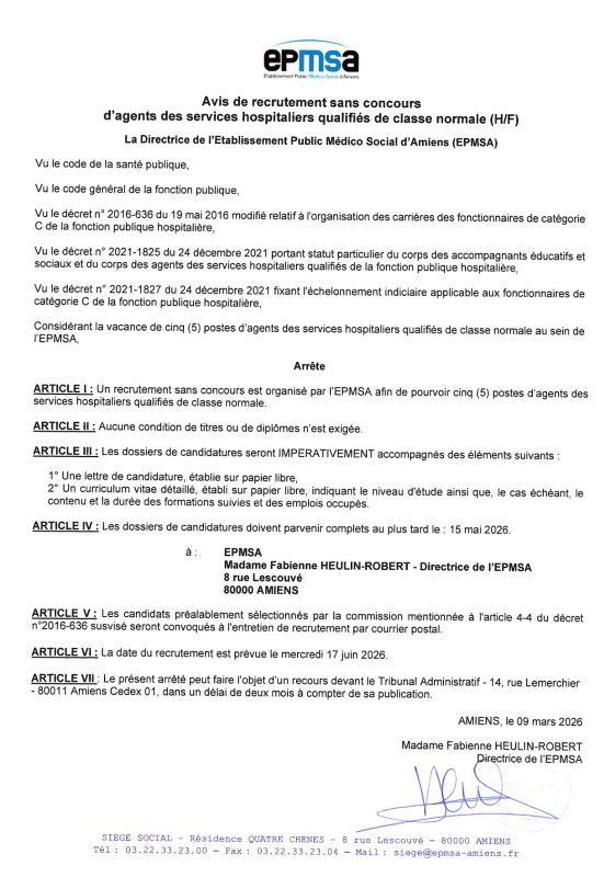 Avis de recrutement sans concours d'agents des services hospitaliers qualifiés :